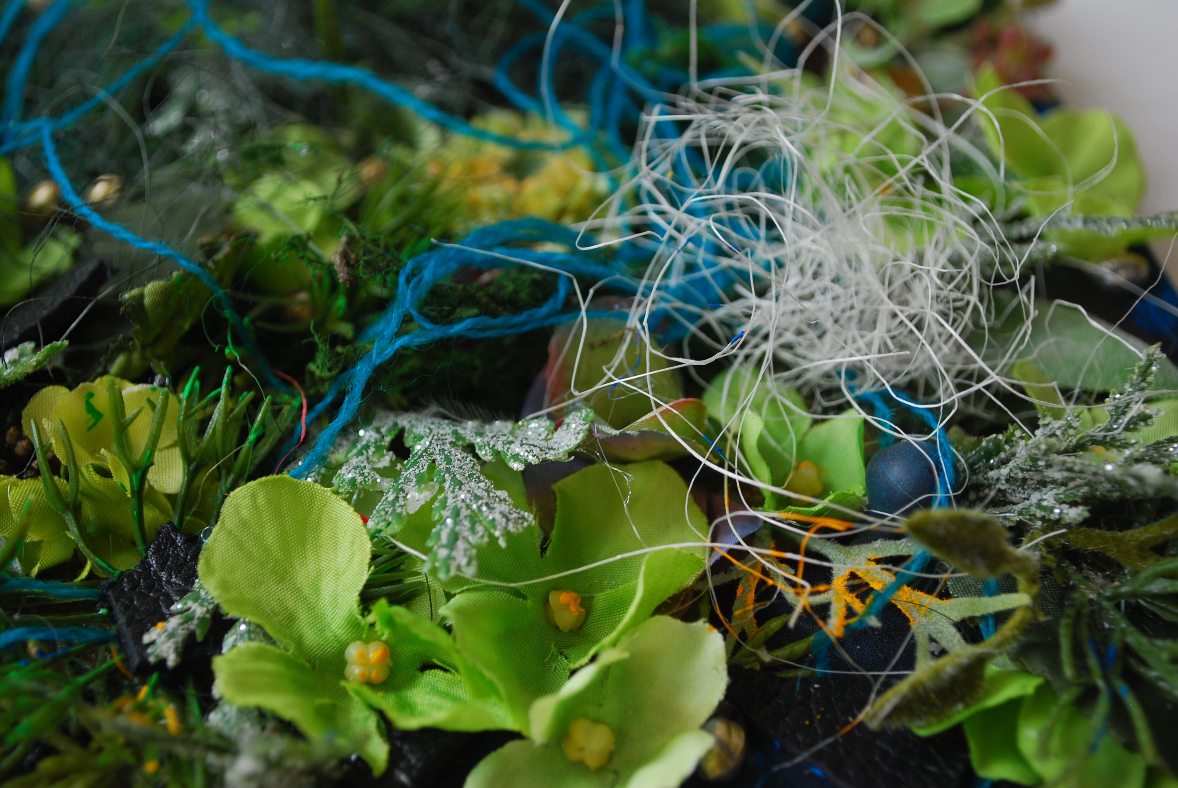 長い間、花の装飾業を重ねていくなかで、装飾に使う花材の余剰分や処理した下の方の花、落ちてしまった部分、など様々な花や材料のカケラ、制作過程から出る不要物、いわゆるゴミとも言えるモノが蓄積されていきます。その蓄積を表現手段として用いているのがこれらのアート作品です。