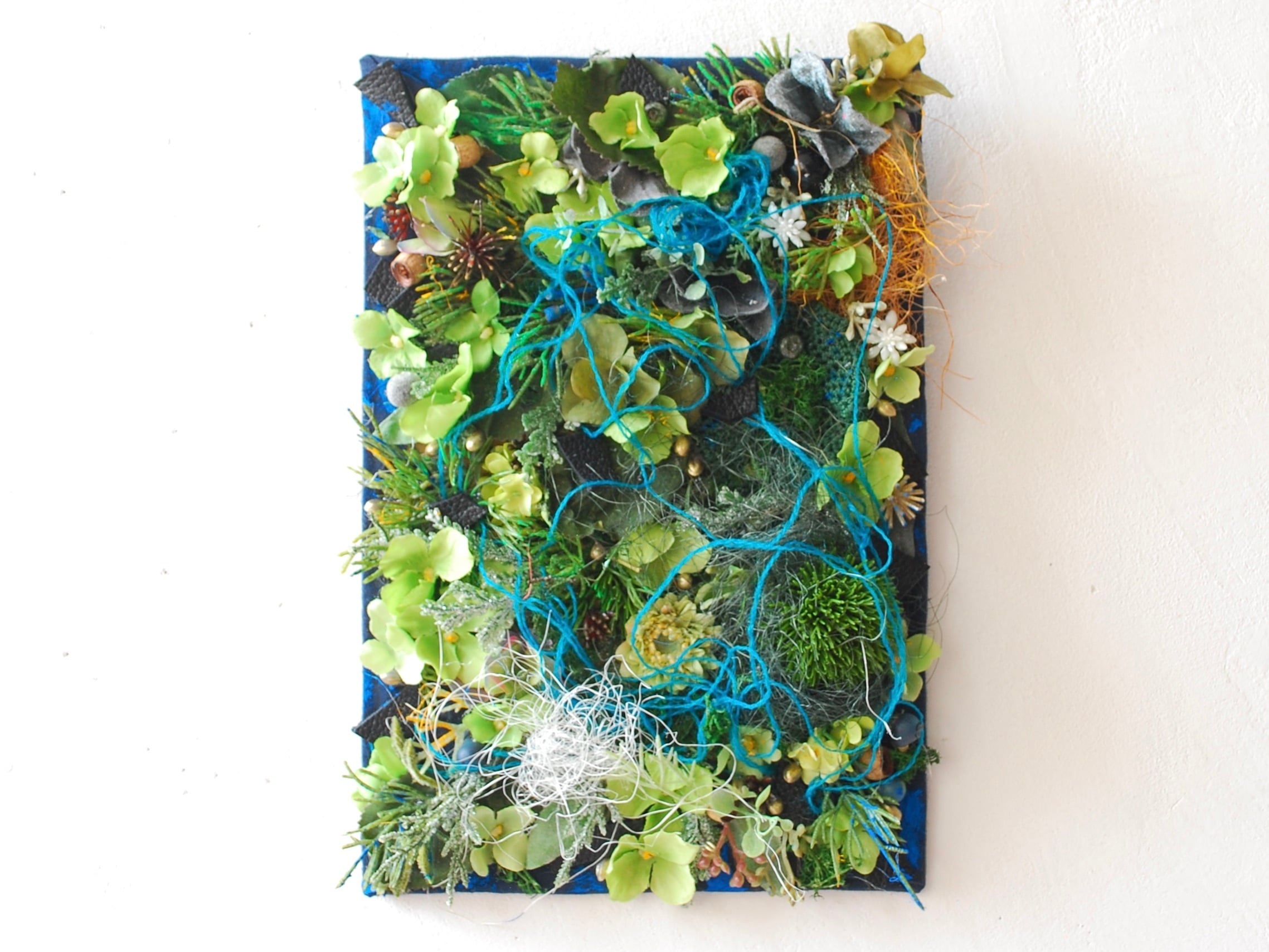 Material : アーティフィシャルフラワー、自然素材、アクリルペイント、ボール紙ベース