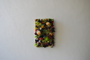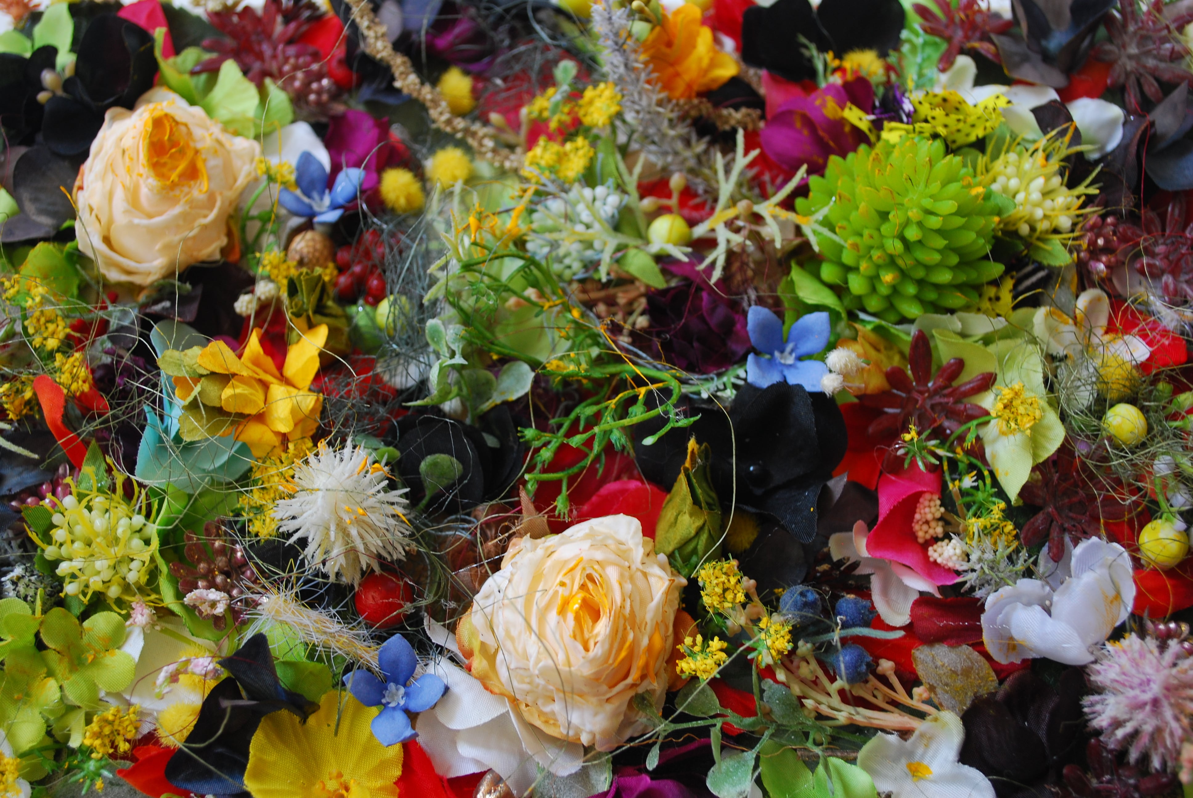 長い間、花の装飾業を重ねていくなかで、装飾に使う花材の余剰分や処理した下の方の花、落ちてしまった部分、など様々な花や材料のカケラ、制作過程から出る不要物、いわゆるゴミとも言えるモノが蓄積されていきます。その蓄積を表現手段として用いているのがこれらのアート作品です。