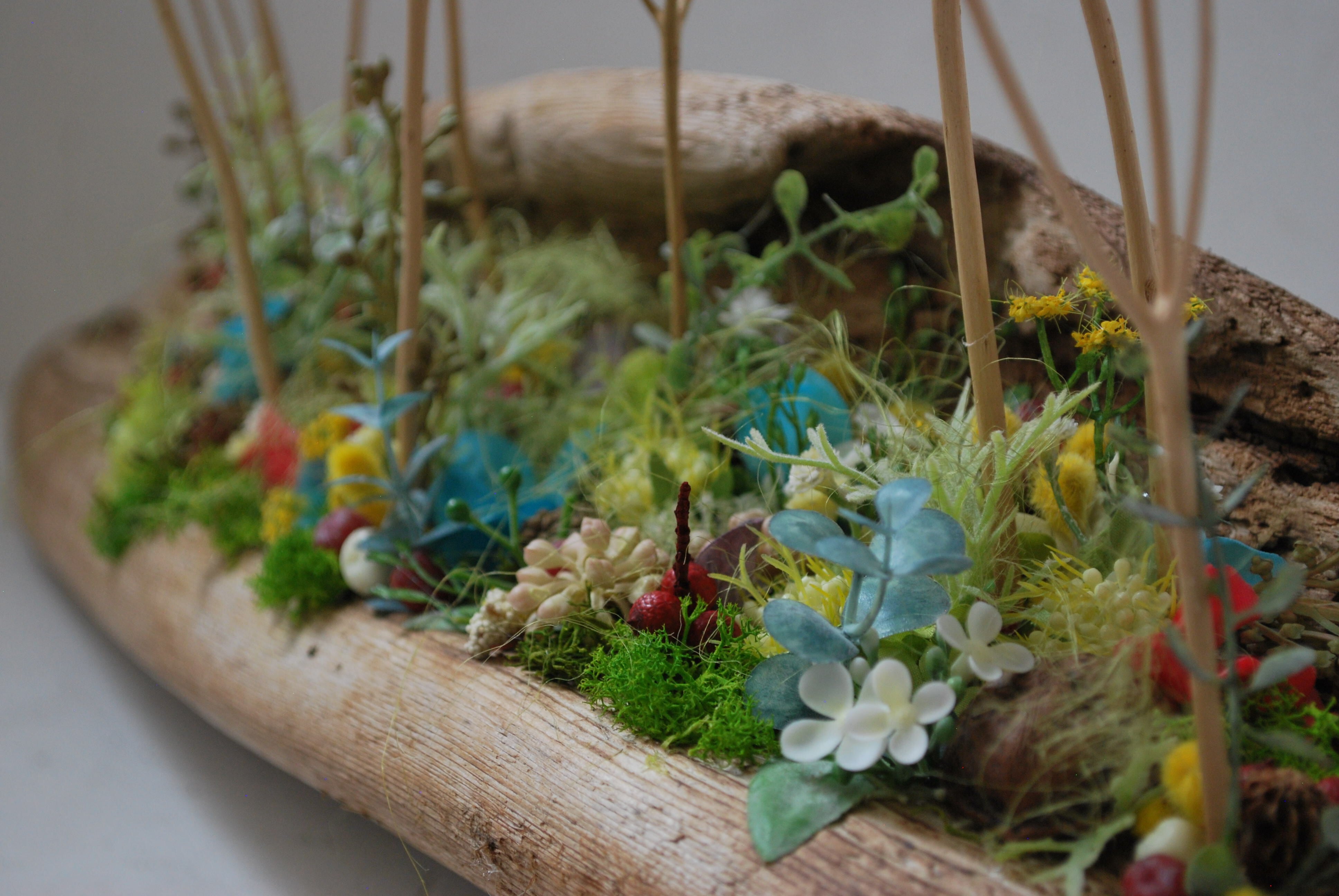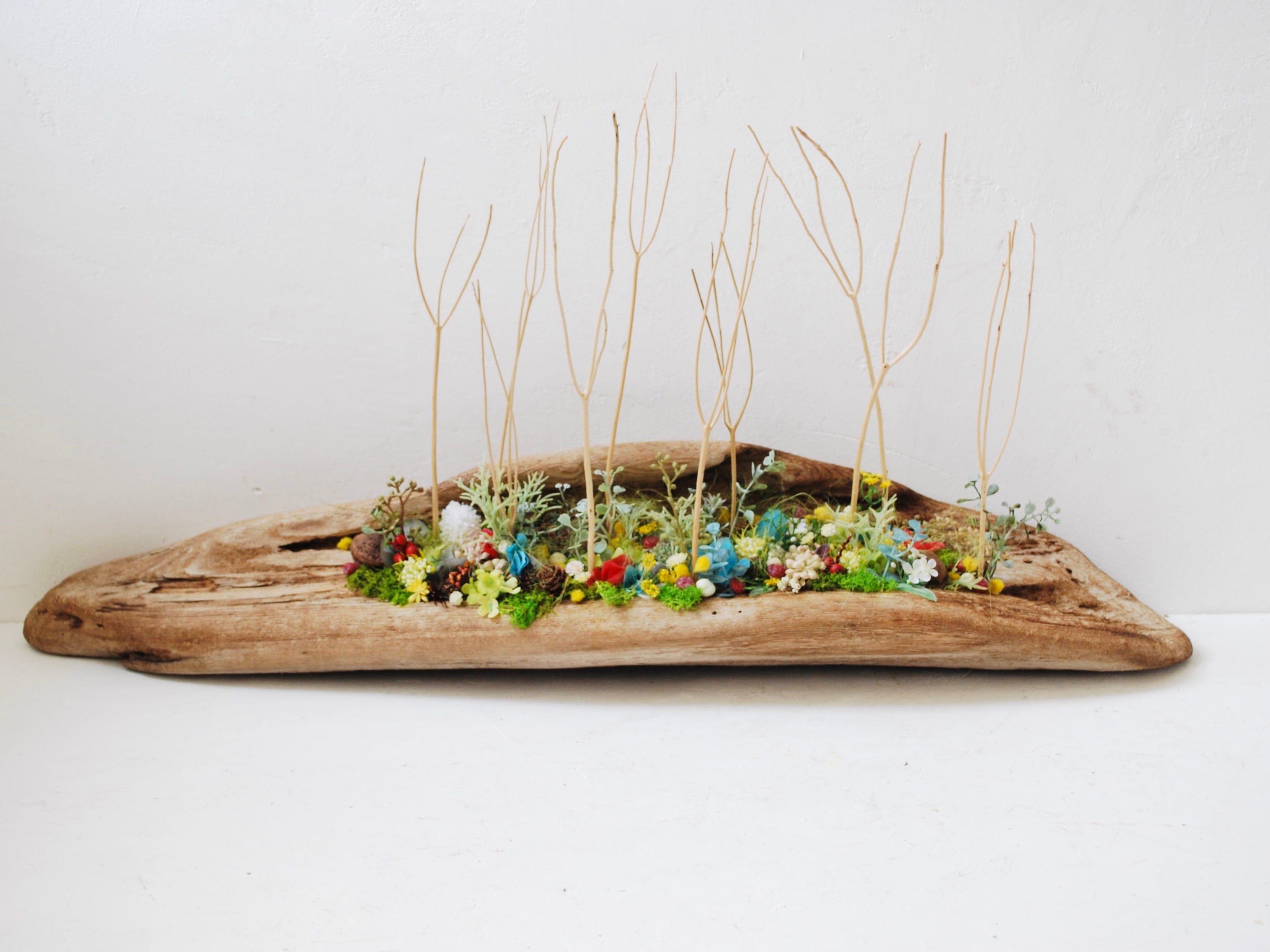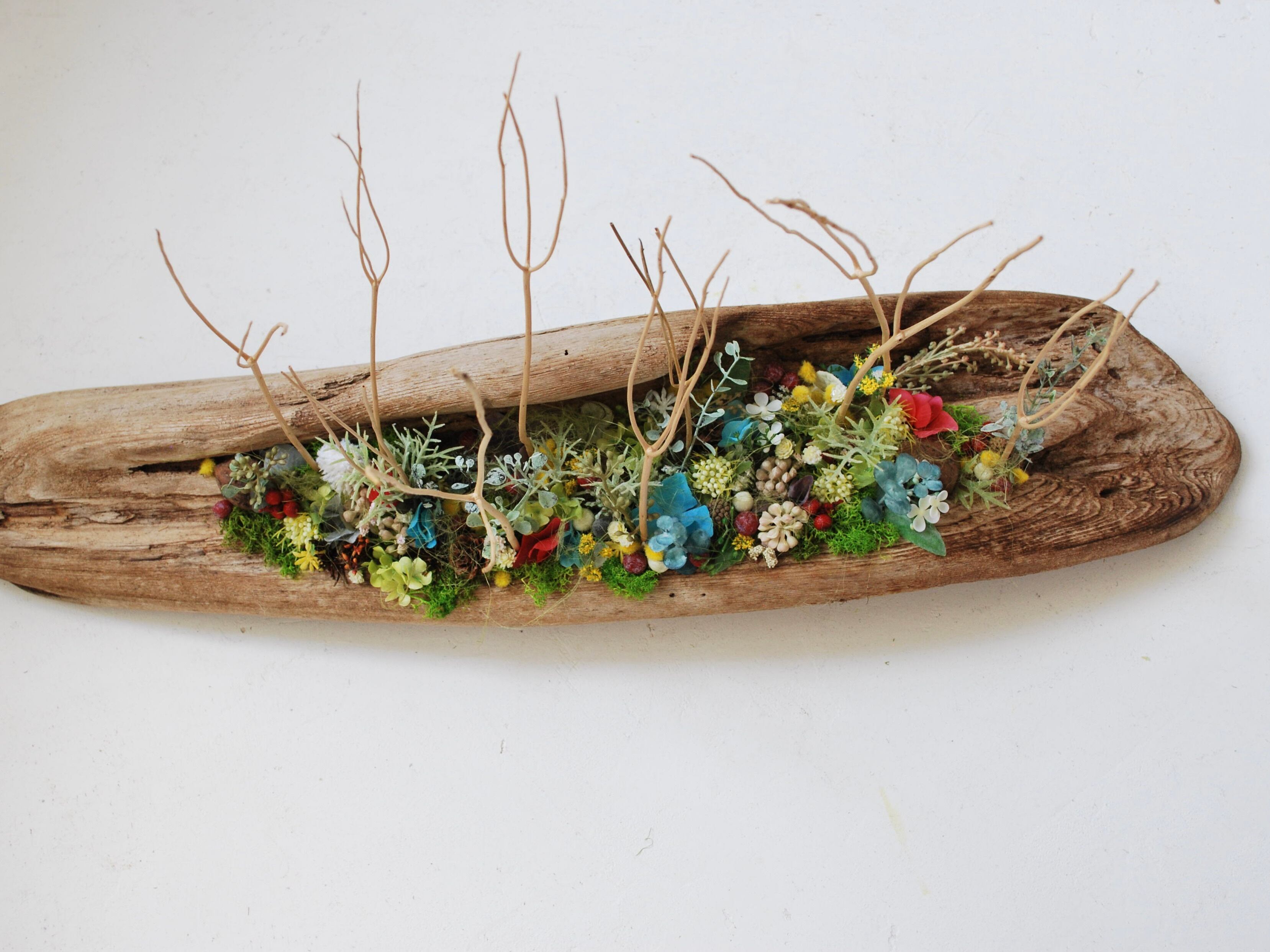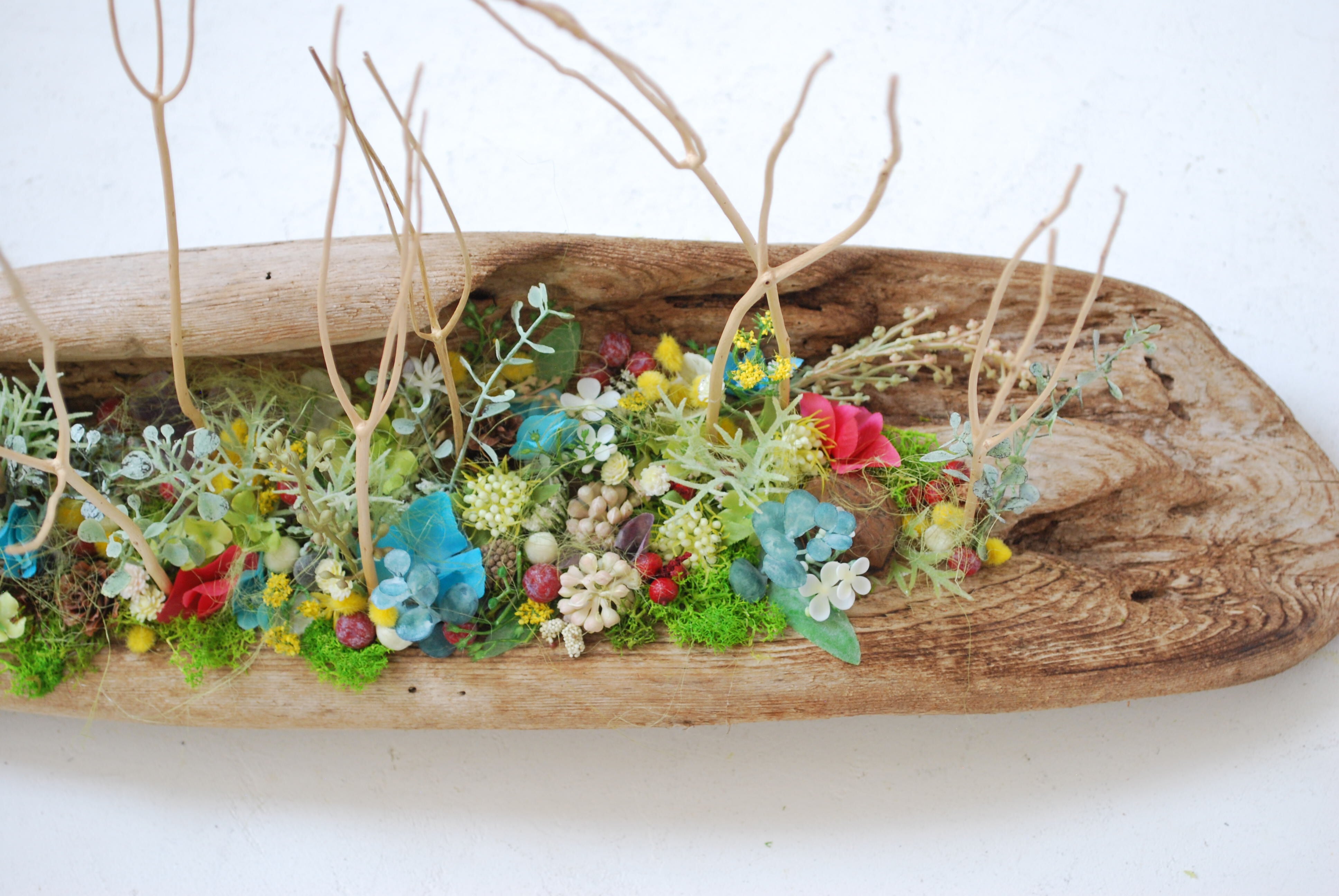 Material : アーティフィシャルフラワー , プリザーブドフラワー, 木の実,流木(自然素材)